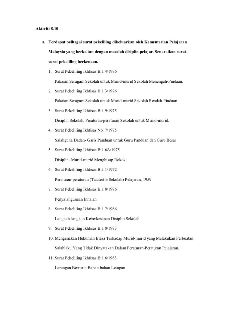 2 ( 5), 5 disember 2014 etika pakaian murid tingkatan enam tujuan 1. Pelaksanaan kurikulum standard sekolah rendah (kssr) (semakan 2017) pendidikan seni visual dan kssr (semakan 2017) pendidikan muzik bagi menggantikan mata pelajaran pendidikan kesenian mulai tahun 2020. Dengan surat pekeliling lkhtisas ini, berkuatkuasakan pada tarikh ia dikeluarkan, rekod pengajaran dan pembelajaran hendaklah mengandungi hanya dua unsur sahaja, iaitu (i) rancangan pelajaran tahunan, dan (ii) rancangan pelajaran harian. Pekeliling ini mengandungi garispanduan mengenai pelaksanaan mesyuarat pagi atau morning prayers di kementerian, jabatan persekutuan, kerajaan negeri dan pejabat daerah. Unit pemodenan tadbiran dan perancangan pengurusan malaysia (mampu), jabatan perdana menteri (jpm), telah menerbitkan pekeliling kemajuan pentadbiran awam (pkpa) bil. Semua jabatan pelajaran negeri (jpn), pejabat pelajaran daerah (ppd) dan sekolah perlu mematuhi tahap kesegeraan menangani isu ini menerusi pelaksanaan standard operating procedure (sop) 1 :