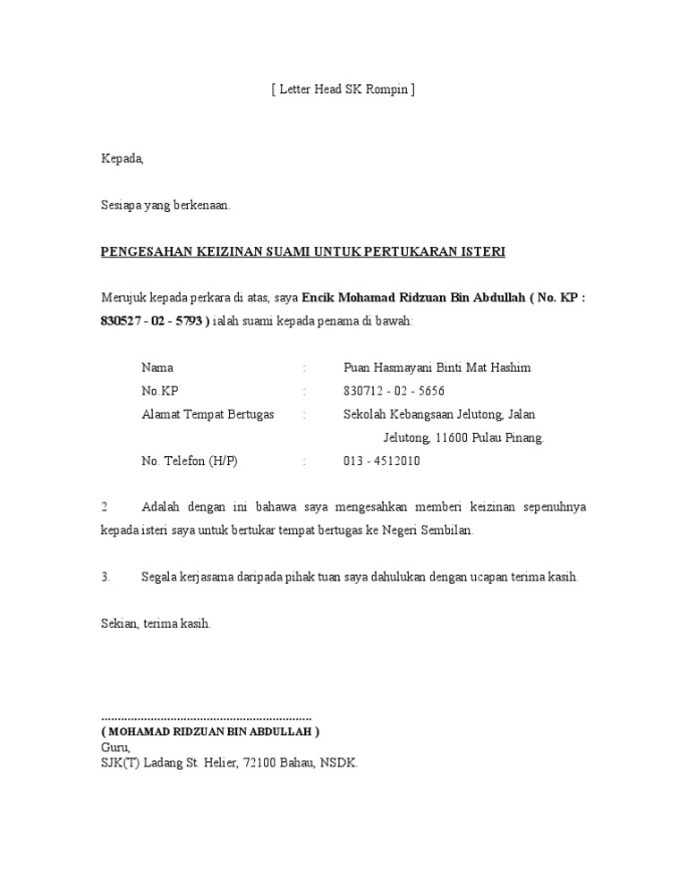 Kepada sesiapa yang berkenaan 5 september 2013. 69521162 contoh surat rayuan an pertukaran mengikut suami. L nama suami alamat tempat kerja suami kepada sesiapa yang berkenaan, tuan, keizinan pertukaran sekolah 16hb september 20xx merujuk perkara di atas, saya nama suami, no kad pengenalan 000 adalah suami kepada pemohon, dengan ini mengesahkan bahawa saya memberikan keizinan kepada isteri saya. Menjelang tahun 1511, melaka telah menjadi masyarakat kosmopolitan contoh surat arahan pertukaran tempat kerja.